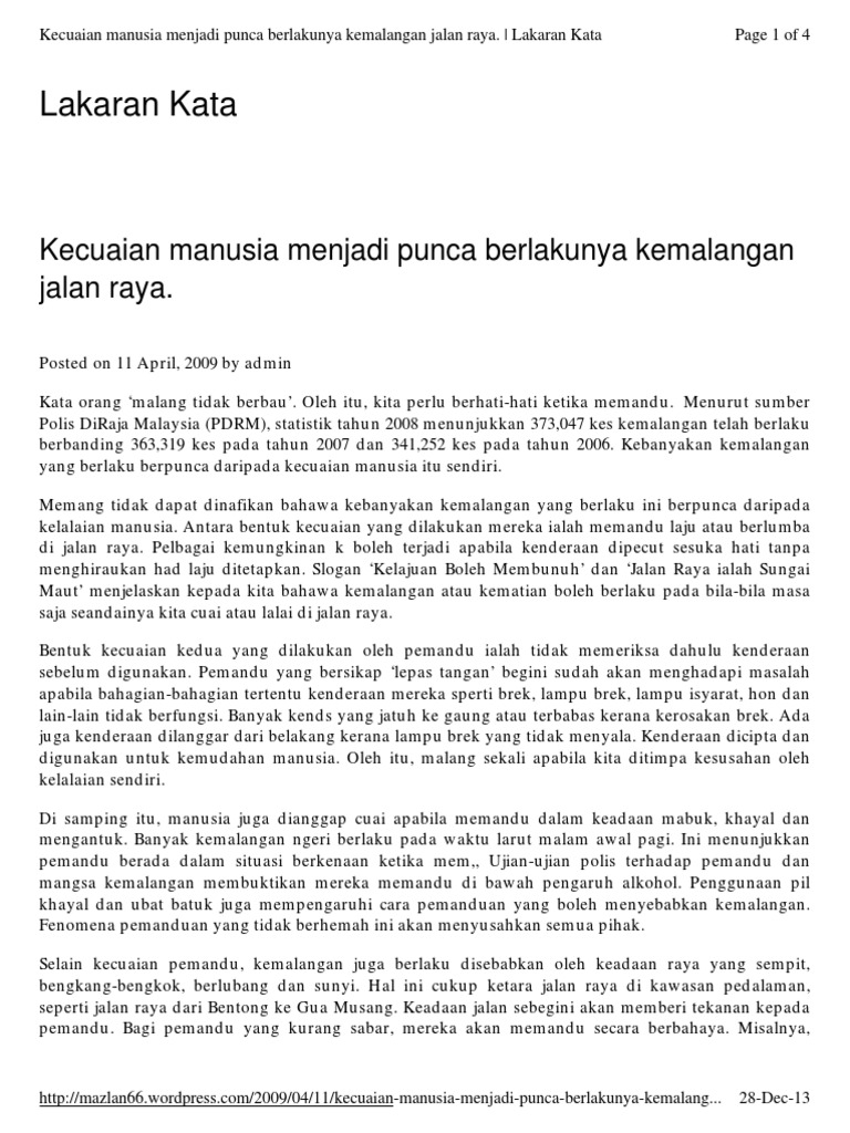 Kemalangan jalan raya daripada perspektif 2.2 kelajuan reka bentuk untuk jalan luar bandar 35 2.3 lebar. Secara intihanya, kemalangan maut di jalan raya berpunca daripada pelbagai faktor. Selain itu, kemalangan jalan raya juga merupakan penyebab kematian kedua tertinggi di malaysia selepas. Sebagai penunggang basikal pula, kita harus sentiasa maklumat ini boleh membantu mengurangkan kadar kemalangan jalan raya. Jalan raya ialah jalan besar atau main road yang menghubungkan satu kawasan dengan kawasan yang lain. Article in jurnal teknologi · june 2003. Dapatkan statistik kemalangan jalan raya untuk faham sepenuhnya tentang kepentingan untuk mendapat insurans kereta komprehensif. = pandangan 60ememangnya2 0ememangnya sikap >7 pemand<b>la! Menurut satu kenyataan yang telah dikeluarkan oleh jabatan kesihatan wilayah persekutuan, sebanyak 20 hingga 30 orang pengguna jalan raya telah terkorban setiap hari. Kenal pasti semua isi punca berlaku kemalangan jalan raya berdasarkan petikan ini. Langkah mengatasi masalah kemalangan jalan raya. Kemalangan lalu lintas di korea utara mengambil 36 nyawa. Oleh kerana itu pihak yang berkenaan seharusnya mengambil tindakan untuk mengatasi masalah ini.